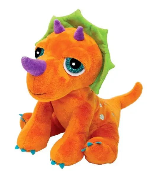 Przyjazny i miękki dinozaur Triceratops w jasno-pomarańczowym kolorze to doskonała przytulanka dla każdego malucha. Ma uroczą limonkową grzywę oraz jasnofioletowe rogi, które dodają mu charakteru.