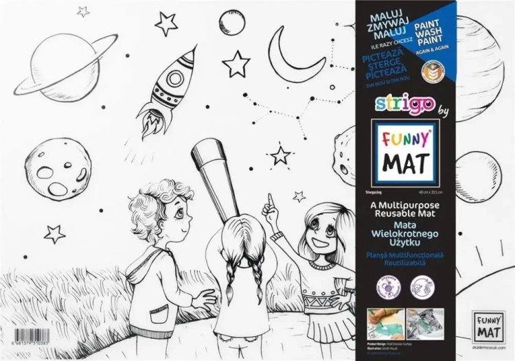 Mata jest wodoodporna i przeznaczona do używania z flamastrami na bazie wody. Po skończonej pracy, tusz łatwo zmyjesz pod bieżącą wodą bądź przy pomocy wilgotnej ściereczki, co pozwala na wielokrotne wykorzystanie produktu. Można również stosować kredki ołówkowe lub miękkie ołówki, do których czyszczenia potrzebna będzie gumka.