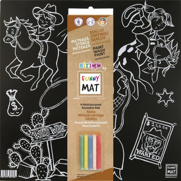 Mata czarna + kreda Western Funny Mat o wymiarach 40x40 cm to produkt, który z pewnością zachwyci wszystkich miłośników kreatywnej zabawy. Ta wodoodporna mata wielokrotnego użytku doskonale nadaje się do rysowania, malowania oraz nauki. Jej głównym przeznaczeniem jest stymulacja wyobraźni i rozwijanie twórczej ekspresji, przy jednoczesnym pełnieniu funkcji edukacyjnej.