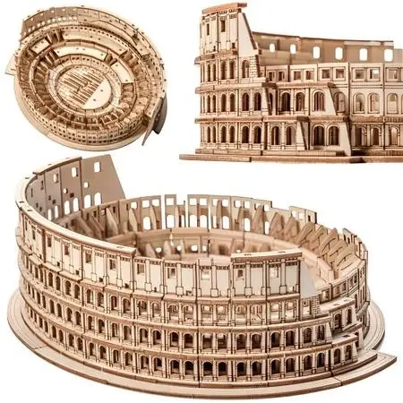Drewniane puzzle 3D przedstawiające Rzymskie Koloseum. Zestaw jest wykonany z wysokiej jakości sklejki i składa się z arkuszy z wstępnie wyciętymi, ponumerowanymi elementami. Montaż wymaga oddzielenia części od wykroju, a następnie ich połączenia bez użycia kleju, zgodnie z załączoną, szczegółową instrukcją. To nie tylko doskonała zabawka edukacyjna, ale również elegancka dekoracja po złożeniu. Uwaga – zestaw zawiera małe elementy, dlatego dzieci muszą być pod nadzorem dorosłych podczas składania.