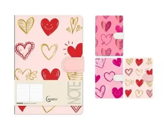 Idealny na wszelkie zapiski, ten notatnik A5 z pewnością spełni Twoje oczekiwania. Posiada 144 kartki i zamknięcie na magnes, co zapewnia wygodę oraz bezpieczeństwo Twoich notatek. Pokrywa notatnika ozdobiona jest uroczymi serduszkami, dodającymi mu niepowtarzalnego uroku.