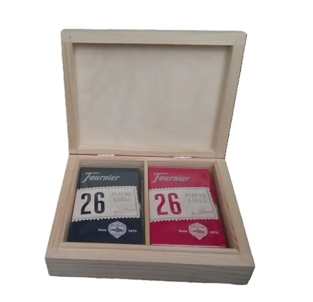 Prezentujemy dwie talie kart Fournier No. 26, zapakowane w elegancką drewnianą szkatułkę, które stanowią idealny wybór dla każdego entuzjasty brydża.