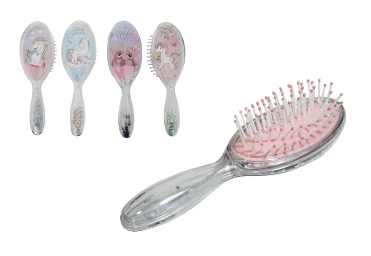 Plastikowa szczotka do włosów ozdobiona motywem jednorożca i holograficznymi gwiazdkami to doskonałe narzędzie do codziennej pielęgnacji włosów. Idealnie nadaje się do rozczesywania pasm, pomagając w tworzeniu różnorodnych, pięknych fryzur.EAN: 5902496163144