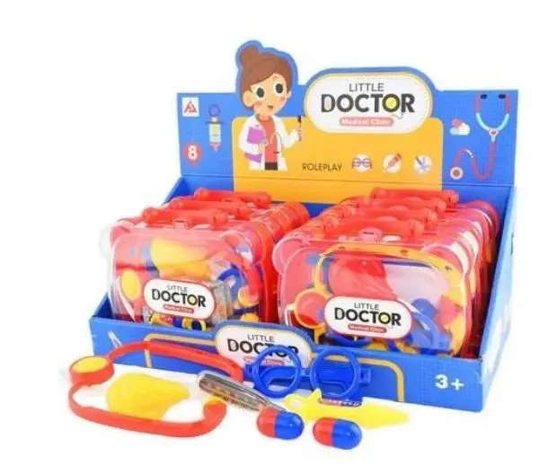 Ten kompaktowy zestaw zawiera 6 elementów: termometr, strzykawkę, stetoskop, receptę/notes, tabletki oraz okulary. Poprzez zabawę dziecko może w prosty i przyjemny sposób oswoić się z wizytą u lekarza. Wszystko zapakowane jest w poręczną, kolorową walizeczkę o wymiarach 19 x 16 x 5 cm.
