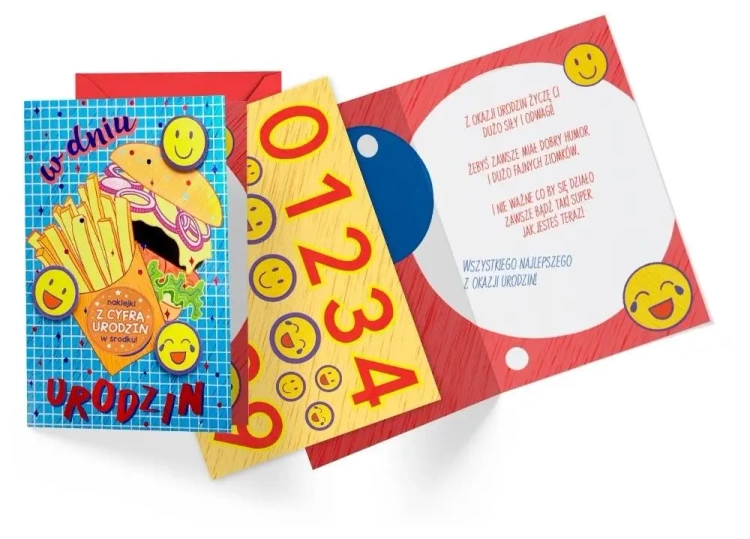 Jest to doskonały wybór łączący atrakcyjną cenę z wysoką jakością wykonania. Karnety tej serii posiadają wyjątkowy dodatek - naklejki z cyferkami, które umożliwiają dopasowanie wieku solenizanta.