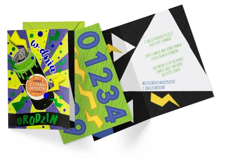 Kartki z tej serii są wyposażone w wyjątkowy dodatek - naklejki z cyferkami, które pozwalają ułożyć dowolny wiek solenizanta.