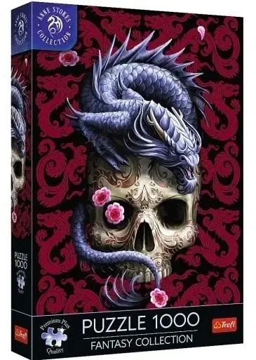Puzzle Orientalny Smok, przedstawiają kolaż z motywem smoka, czaszki i kwiatów. Po ich ułożeniu powstanie obraz o wymiarach 683x480 mm.