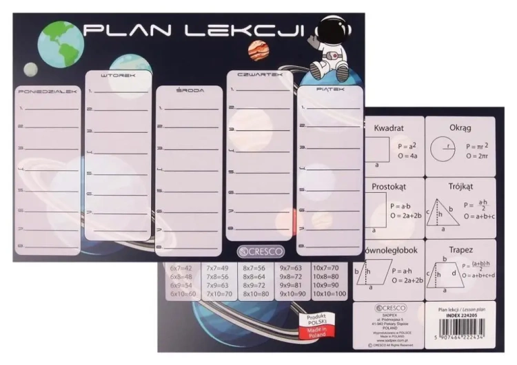 Ciekawa funkcjonalność to umieszczona na odwrocie tabliczka mnożenia oraz podstawowe wzory matematyczne. Dzięki temu, uczniowie mają szybki dostęp do przydatnych informacji w czasie nauki.