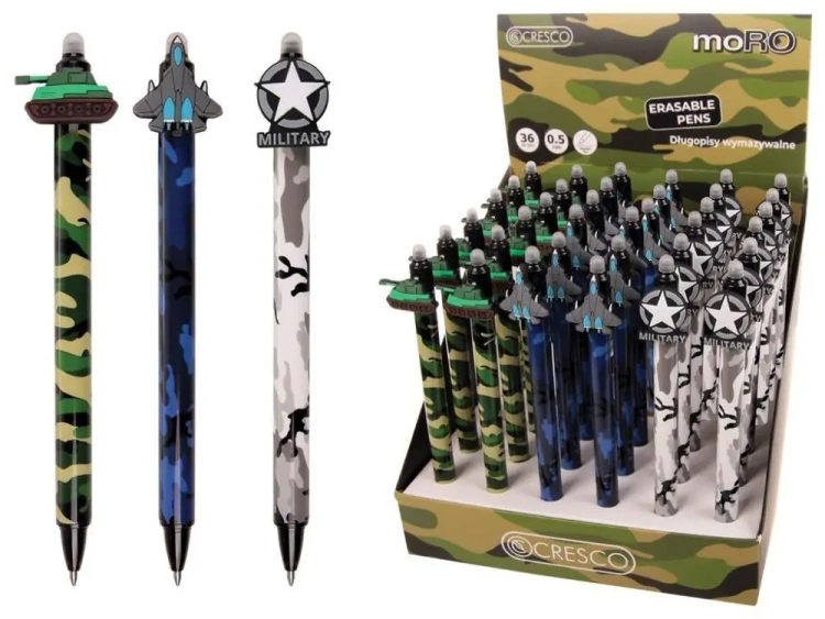 Przedstawiamy wymazywalny długopis CRESCO inspirowany motywami militarnymi. Dzięki wygodnemu mechanizmowi klikającemu, masz szybki dostęp do niebieskiego wkładu, zapewniającego precyzyjne pisanie o grubości 0,5mm. W każdej paczce znajduje się zestaw 36 sztuk długopisów z różnorodnymi wzorami.