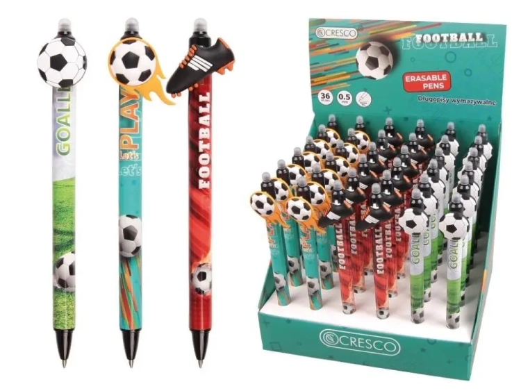 Długopis wymazywalny CRESCO z unikalnym motywem piłkarskim: buty, koszulka, piłka. Wyposażony w mechanizm kliknięcia, dzięki któremu łatwo wysuwa się niebieski wkład o szerokości linii pisania 0,5 mm. W jednym opakowaniu znajduje się 36 sztuk w różnych wzorach.