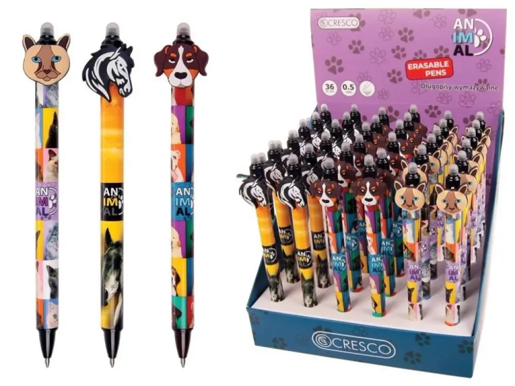 Długopis wymazywalny marki CRESCO z motywem Animals to idealne rozwiązanie dla osób ceniących sobie praktyczność i oryginalny design. Dzięki wygodnemu pstrykanemu systemowi wysuwasz niebieski wkład o grubości linii 0,5 mm, co pozwala na precyzyjne pisanie i łatwe poprawianie błędów. Zestaw zawiera 36 sztuk w różnych wzorach, co sprawia, że każdy znajdzie coś dla siebie.