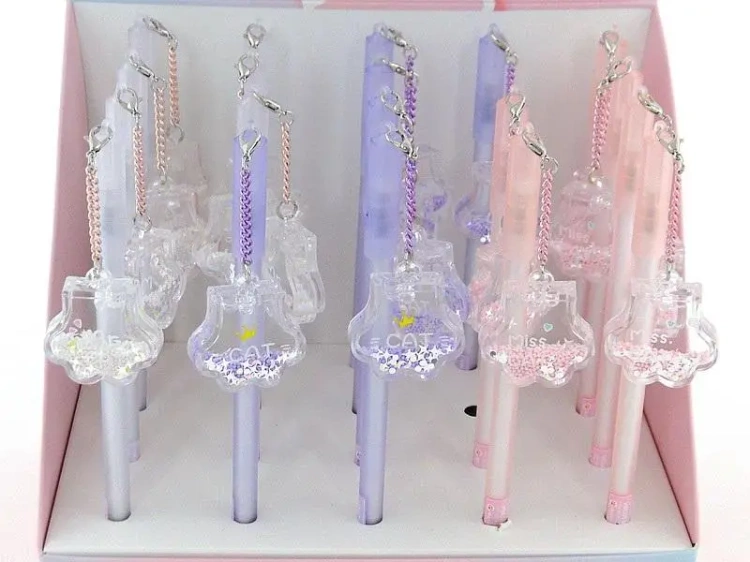 Prezentujemy elegancki długopis z zawieszką, która przedstawia urocze kocie łapki, wypełnione płynnym brokatem. Ten unikalny zestaw zawiera 20 sztuk długopisów, co czyni go idealnym na prezentacje czy jako efektowny dodatek na biurko.