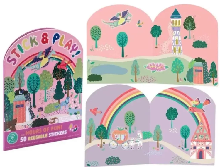 Zestaw Naklejek Wielokrotnego Użytku z planszami to świetna zabawa i nauka jednocześnie. W skład zestawu wchodzi ponad 50 zabawnych naklejek, w tym księżniczki, latające smoki, bajeczne ptaki, jelenie, koń, powóz i wiele innych, oraz 2 rozkładane plansze ilustrujące bajkowy świat do tworzenia i wymyślania historii za pomocą naklejek. Naklejki można łatwo umieszczać, nakładać na siebie i zmieniać ich położenie. Dodatkową atrakcją jest dopasowywanie naklejek do ich kształtów na kartach do przechowywania, co zapewni maluchom rozrywkę na długie godziny! Zestaw daje dzieciom nieograniczone możliwości wyrażania swojej kreatywności, ćwiczy koncentrację i wyobraźnię, a także rozwija małą motorykę. Zapakowany jest w twardą okładkę, składa się całkowicie na płasko, dzięki czemu idealnie sprawdzi się w podróży. Cechy: