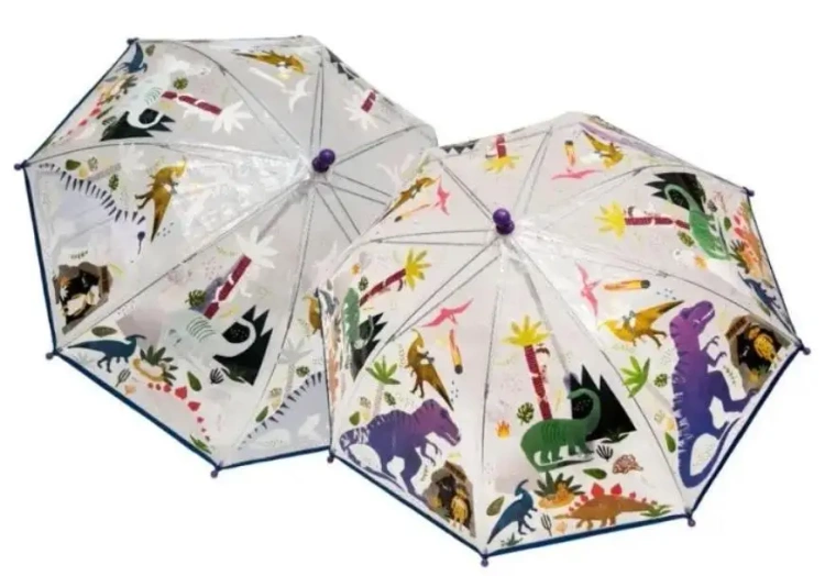 Pozwól swojemu dziecku cieszyć się niezapomnianymi chwilami podczas spacerów w deszczowe dni dzięki parasole zmieniającej kolory. Gdy tylko zacznie padać, białe wzory na powierzchni parasola w magiczny sposób nabierają barw, wypełniając się kolorowymi ilustracjami z krainy dinozaurów, rozweselając nawet najbardziej ponury dzień. Po wyschnięciu, kolory powracają do początkowej bieli.