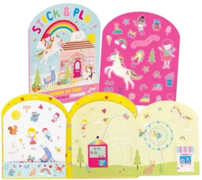 Zestaw Naklejek Wielokrotnego Użytku z planszami to świetna zabawa i nauka jednocześnie. W skład zestawu wchodzi ponad 50 zabawnych naklejek, w tym kolorowe wróżki, jednorożce, miś z hula-hoop, wesołe zwierzaki i wiele innych, oraz 2 rozkładane plansze ilustrujące bajkowy świat tęczowych wróżek do tworzenia i wymyślania historii za pomocą naklejek. Naklejki można łatwo umieszczać, nakładać na siebie i zmieniać ich położenie. Dodatkową atrakcją jest dopasowywanie naklejek do ich kształtów na kartach do przechowywania, co zapewni maluchom rozrywkę na długie godziny! Zestaw daje dzieciom nieograniczone możliwości wyrażania swojej kreatywności, ćwiczy koncentrację i wyobraźnię, a także rozwija małą motorykę. Zapakowany jest w twardą okładkę, składa się całkowicie na płasko, dzięki czemu idealnie sprawdzi się w podróży. Cechy: