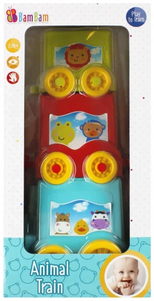 Przeznaczona dla dzieci w wieku 6 miesięcy i starszych, Kolejka Zwierzaczki BAM BAM jest pakowana w atrakcyjny kartonik z okienkiem.