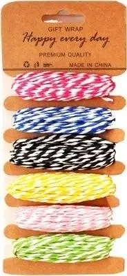 Zestaw zawiera sześć sznurków wykonanych z papieru, w różnych kolorach, zamocowanych na solidnej brązowej tekturze.