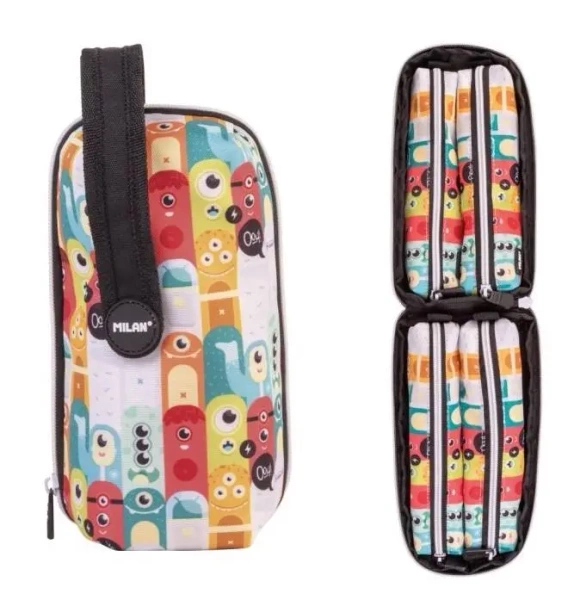 Multipiórnik MILAN z serii ALIENS to wielofunkcyjne rozwiązanie dla każdego ucznia. Składa się z pięciu elementów: jednej dużej saszetki-pokrowca i czterech mniejszych piórników-saszetek. Główna saszetka zamykana jest na suwak oraz posiada uchwyt na rzep, a cztery mniejsze piórniki z wyposażeniem można przyczepiać na rzepy, co umożliwia ich używanie zarówno razem, jak i oddzielnie.