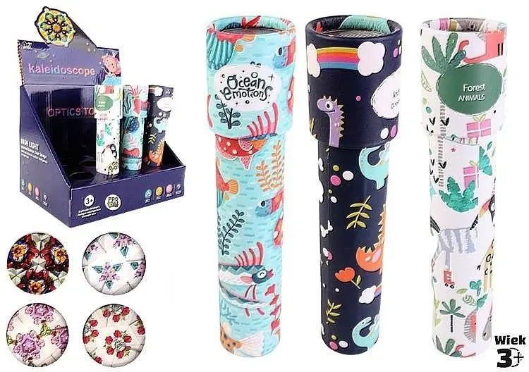 Każdy kalejdoskop posiada unikalny, przyciągający wzrok wzór na zewnętrznej powierzchni, który zainteresuje każde dziecko.