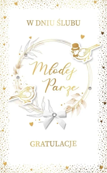 Luksusowy karnet Ślubny z elementami złocenia lub srebrzenia, wykonany na specjalnym, grubym kartonie z licznymi dodatkami.