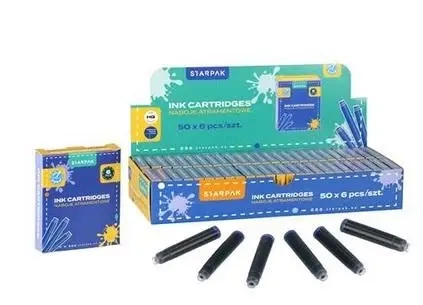 W naszym asortymencie znajdziesz naboje atramentowe do piór z serii Starpak, które idealnie sprawdzą się zarówno w edukacji, jak i w biurze. Te krótkie naboje atramentowe są wypełnione błyskawicznie schnącym tuszem w odcieniu niebieskim.