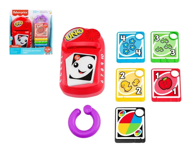 Teraz Twoje dziecko może dołączyć do rodzinnego wieczoru gier dzięki Uczącemu Uno Ucz się i śmiej! od Fisher-Price z liczeniem i kolorami! Ta zabawkowa wersja Uno ma 5 kart, które można wkładać do podstawy, aby aktywować światełka, muzykę, dźwięki i wypowiedzi wprowadzające malucha w świat cyferek, kolorów i przedmiotów przedstawionych na kartach. Dzięki wygodnemu zaczepowi do przyczepiania kart możesz łatwo zabrać ze sobą ulubioną grę dziecka, gdziekolwiek chcesz! Naciśnij przycisk, aby wybrać