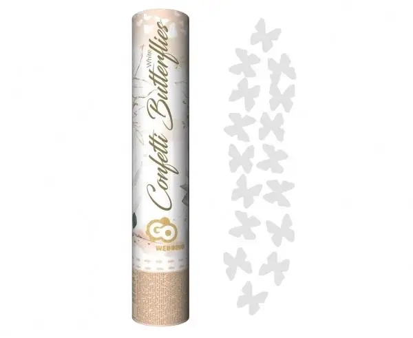 "KONFETTI MOTYLKI BIAŁE, TUBA STRZELAJĄCA, 30 cm - 1 szt. Kolor: biały Wzór: motylki Materiał: papier Ilość sztuk: 1 tuba strzelająca Długość tuby: 30 cm Kolekcja: GO WEEDING Producent: Godan S.A. Po przekręceniu z tuby wylatują w górę białe motylki tworząc widowiskowy efekt. Konfetti nie zawiera ładunków pirotechnicznych. Wyrzut następuje za pomocą sprężonego powietrza. Produkt przeznaczony tylko dla osób dorosłych. "