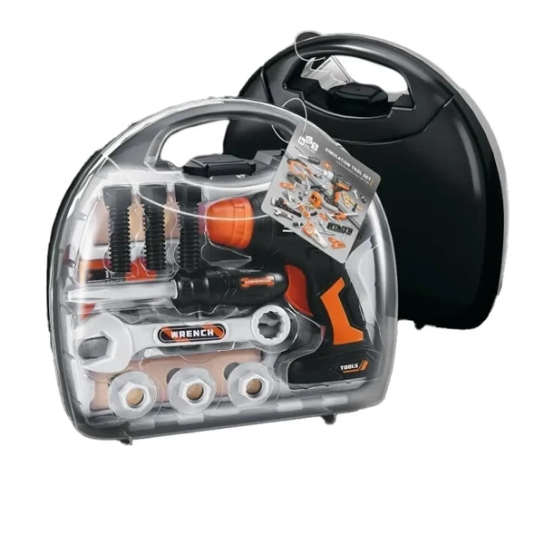 Wiertarka na frykcję (nie wymaga baterii) w skrzynce z akcesoriami. W skład akcesoriów wchodzą: wiertła, śrubki, nakładki, miarka, śrubokręt, klucz francuski.