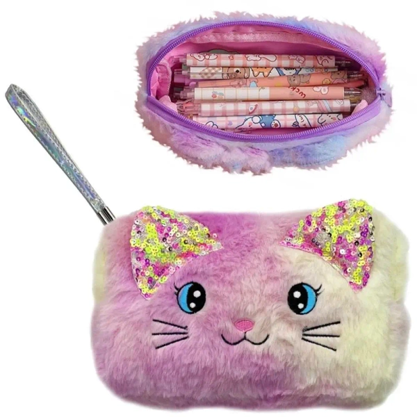 Torebka kotek zapinana na zamek. Wykonana z pluszowego materiału w pastelowych kolorach.