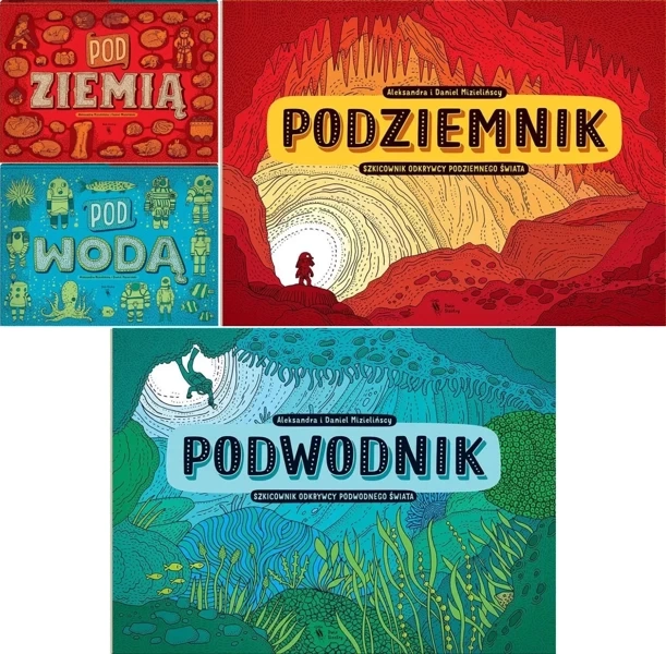 Nowy, dwustronny album Aleksandry i Daniela Mizielińskich. Po obrazkowej podróży po lądach, morzach i kulturach świata nadszedł czas na książkową wyprawę do wnętrza ziemi i w głębiny mórz i oceanów. Pod ziemią, pod wodą to naładowana informacjami księga pełna ogromnych ilustracji i szczegółowych przekrojów. Poprowadzą was one w głąb naszej planety, pokazując, co kryje się pod powierzchnią lądów i wód. Będziecie schodzić coraz głębiej i głębiej od cienkiej warstwy gleby tuż pod stopami do gorącego jądra Ziemi, od skąpanych w słońcu raf koralowych do pogrążonego w ciemności i chłodzie najgłębszego miejsca oceanów. Znajdziecie tam zwierzęta żyjące pod ziemią i dziwne głębinowe stworzenia, najgłębiej sięgające korzenie i plątaniny podziemnych rur, sensacyjne wykopaliska i skamieniałe kości dinozaurów. Zajrzycie do podziemnych nor i norek, zapuścicie się w labirynty jaskiń i zjedziecie na dno najgłębszej kopalni świata. Wypróbujecie zabytkowe okręty podwodne, zanurkujecie w podmorskiej studni i odwiedzicie wrak Titanica. Odkryjecie tajemnice podziemnego i podwodnego świata. Części Pod ziemią i Pod wodą zaczynają się po przeciwnych stronach książki, by spotkać się w środku, na rozkładówce poświęconej jądru Ziemi.