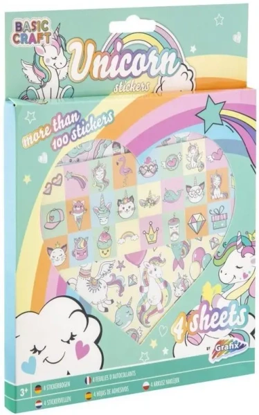 Zestaw naklejek z motywem jednorożca. W pudełku 4 arkusze naklejek (ponad 100 sztuk) wymiar 17.5 cm x 1 cm x 17.5 cm . Łatwo można je odkleić od powierzchni, na której zostały przyklejone. Sprawdzą się idealnie do ozdabiania prezentów, zeszytów, piórników . Przeznaczone dla dzieci powyżej 3 roku życia.