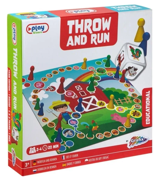 Rzuć i uciekaj Farma to, gra planszowa dla 2, 3 i 4 osób. W zestawie znajduje się plansza przedstawiająca motyw farmy, pionki i kostka do gry. Grafika i piękna kolorystyka zachęcają do rzutu kostką i sprawdzeniu, kto pierwszy zakończy wyścig.