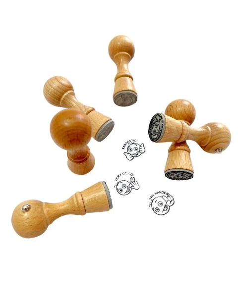 W zestawie znajduje się 6 stempli, które przedstawiają różne emocje wraz z anglojęzycznym komentarzem odpowiednim do każdej z nich: TRY AGAIN!, TRY HARDER!, SATISFACTORY!, GOOD!, VERY GOOD!, FANTASTIC!. Dzięki temu można w przystępny sposób wyrazić opinię o pracy dziecka.