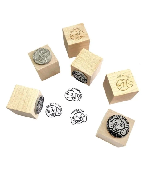Zestaw składa się z sześciu pieczątek, które prezentują różne emocje i są opatrzone określonymi napisami: TRY AGAIN!, TRY HARDER!, SATISFACTORY!, GOOD!, VERY GOOD!, FANTASTIC! Każda z tych pieczątek oferuje unikalny sposób wyrażenia poziomu zadowolenia z pracy dziecka.