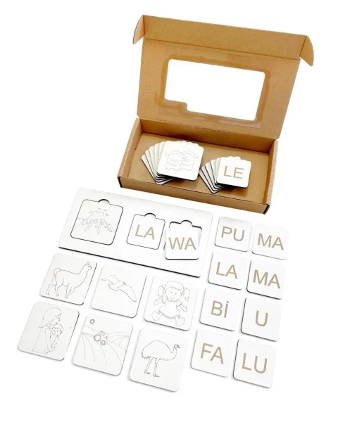 Ilość elementów: 30 elementów: 13 płytek z obrazkami (MAMA, LAMA, LALA, MAPA, LAWA, ULE, MEWA, POLE, PUMA, LUPA, BILA, EMU, FALE), 16 płytek z sylabami (z paradygmatami P, M, L, B, F, W) oraz podstawą bazową