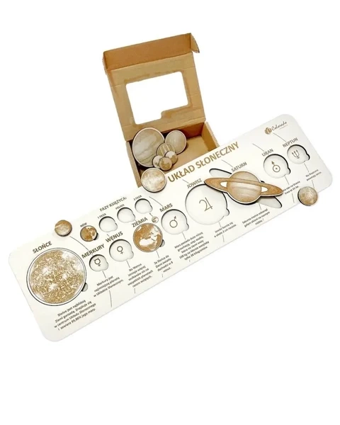 drewnianą tablicę z wyciętymi planetami oraz wygrawerowanymi symbolami i ciekawostką dotyczącą każdej z nich,