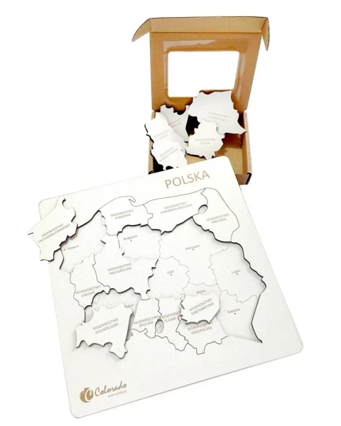 16 puzzli w kształcie województw z wygrawerowanymi ich nazwami.
