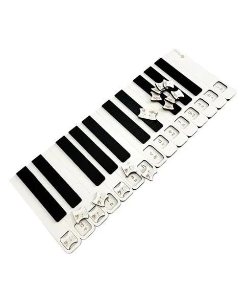 Prezentujemy drewniane pianino edukacyjne do nauki rozkładu nut. Zestaw składa się z pianina z wygrawerowanymi laserowo klawiszami oraz płytek z nutami w kluczu wiolinowym i basowym (15 sztuk). Wielkość pianina wynosi 53 cm x 19 cm. Zestaw wykonano z płyty HDF o grubości 3mm.