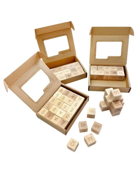 Wszystkie klocki będą do siebie pasować mają formę kostek z naturalnego drewna bukowego o wymiarach 25 x 25 x 25mm. Klocki zostały zapakowane w kartonowe pudełko, w którym można przechowywać wszystkie elementy. Trzy połączone zestawy umożliwiają układanie nawet dłuższych słówek oraz całych zdań. Będą przydatne także podczas utrwalania literek.