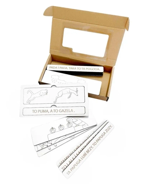 Ilość elementów: 25 z czego 12 płytek z obrazkami oraz 12 płytek ze zdaniami (utworzonymi z sylab prymarnych otwartych z wykorzystaniem paradygmatów P, M, L, B, F, W, T, D, S, K, Z, G) oraz podstawą bazową,