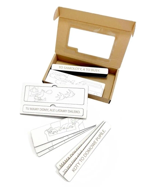 Ilość elementów: 25 z czego 12 płytek z obrazkami oraz 12 płytek ze zdaniami (utworzonymi z sylab prymarnych otwartych z wykorzystaniem paradygmatów P, M, L, B, F, W, T, D, S, K) oraz podstawą bazową,