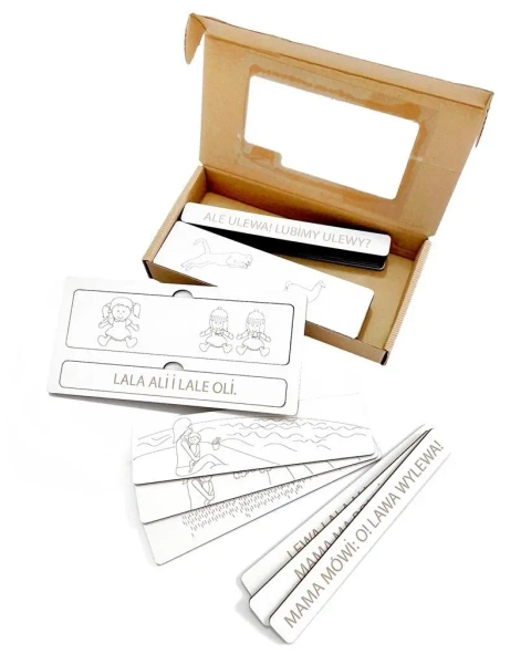 Ilość elementów: 25 z czego 12 płytek z obrazkami oraz 12 płytek ze zdaniami (utworzonymi z sylab prymarnych otwartych z wykorzystaniem paradygmatów P, M, L, B, F, W) oraz podstawą bazową,