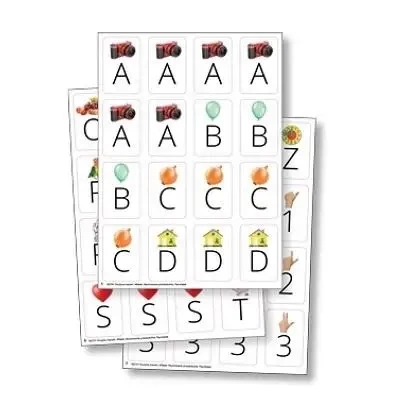 Zestaw kartoników z literami i obrazkami, których nazwy rozpoczynają się daną głoską, a także z liczbami przedstawionymi za pomocą palców dłoni i cyfr.