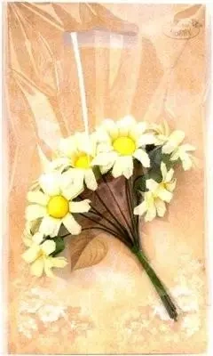 Prezentujemy urocze margerytki materiałowe, starannie skręcone w jedną elegancką wiązkę. Te kwiatki są niezwykle wszechstronne – możesz je łatwo oddzielić, aby wykorzystać pojedynczo do różnorodnych dekoracji lub zastosować całą kompozycję jako jeden element ozdobny.
