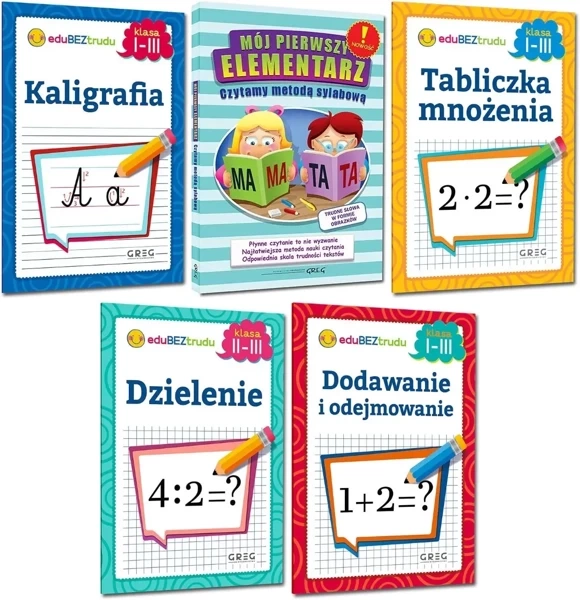 ZESTAW KSIĄŻECZEK Dodawanie odejmowanie mnożenie dzielenie kaligrafia GREG - Alicja Karczmarska-Strzebońska