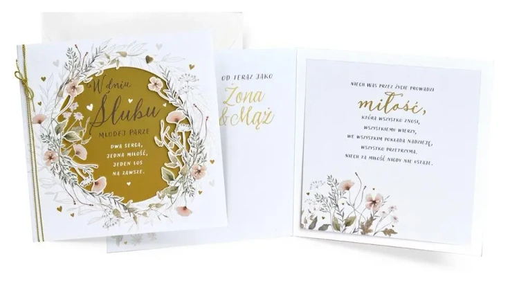 W środku każdej kartki znajdują się dobrane do okazji życzenia, a do kartki dołączona jest dopasowana koperta.