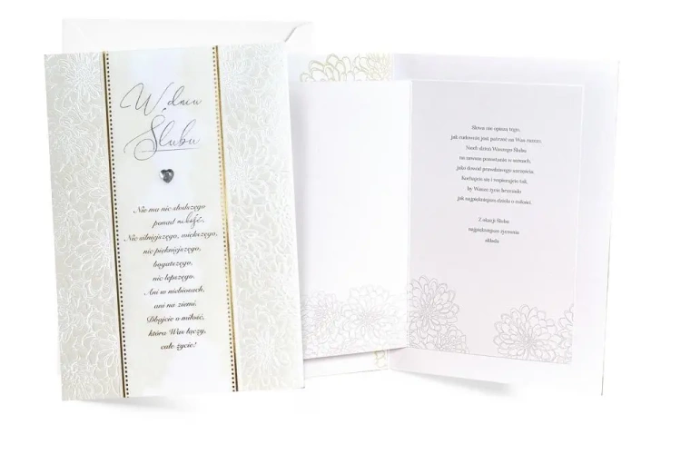 W środku każdej kartki znajdują się dobrane do okazji życzenia, a do kartki dołączona jest dopasowana koperta.