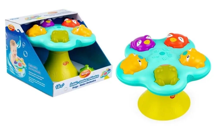 Zostań dyrygentem uroczej, żabiej orkiestry! Naciskaj żabki, aby bawić się razem z nimi, przy wesołych dźwiękach, kolorowych światełkach i zróżnicowanych strumieniach tryskającej wody! Zapomnij o nudzie, każda z żabek zna inną melodię, dzięki czemu zabawa z nimi to prawdziwa frajda. Aby uruchomić zabawkę, należy długo przytrzymać okrągły przycisk, znajdujący się na środku. Po uruchomieniu, każde kolejne, pojedyncze naciśnięcie guziczka spowoduje zmianę sposobu wytryskiwania wody. W zestawie poza fontanną, przypominającą staw, wypełniony żabkami, znajdziesz także przyssawki do przymocowania zabawki do gładkiej, czystej powierzchni