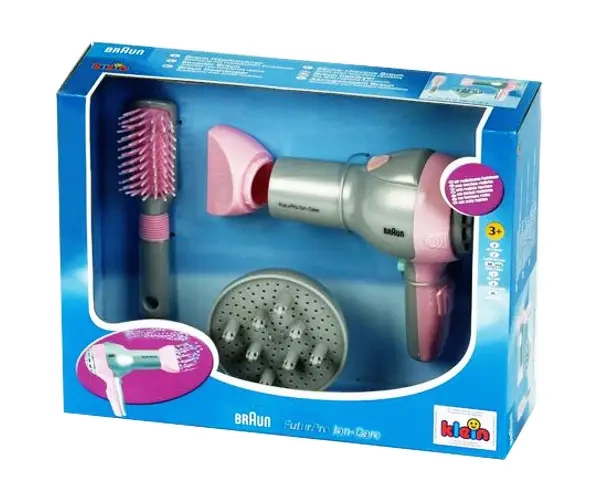 Dzięki zabawie suszarką Braun z dyfuzorem i szczotką, stylizuj i układaj fryzury jak prawdziwa fryzjerka! Suszarka dmucha powietrzem, ale nie nagrzewa się, dzięki czemu jest całkowicie bezpieczna w użytkowaniu przez dzieci. Zabawka stworzona jest na licencji firmy Braun i swoim wyglądem nawiązuje do urządzenia istniejącego w rzeczywistości. Zabawka jest nie tylko bezpieczna w użytkowaniu, ale sprawia również, że dziecko czuje się jakby korzystało z prawdziwej suszarki. Niemiecka firma Klein specjalizuje się w tworzeniu zabawek na licencji. Małe, plastikowe zabawki wyglądają niczym prawdziwe, elektroniczne urządzenia codziennego użytku. Kolekcja suszarek Klein na licencji Braun jest propozycją skierowaną głównie dla dziewczynek. Seria oferuje szeroką gamę produktów doskonale uzupełniających się na wzajem. Podczas zabawy dzieci mogą naśladować zaobserwowane w świecie dorosłych sytuacje. Zabawka wymaga użycia baterii, które nie są częścią tego zestawu.