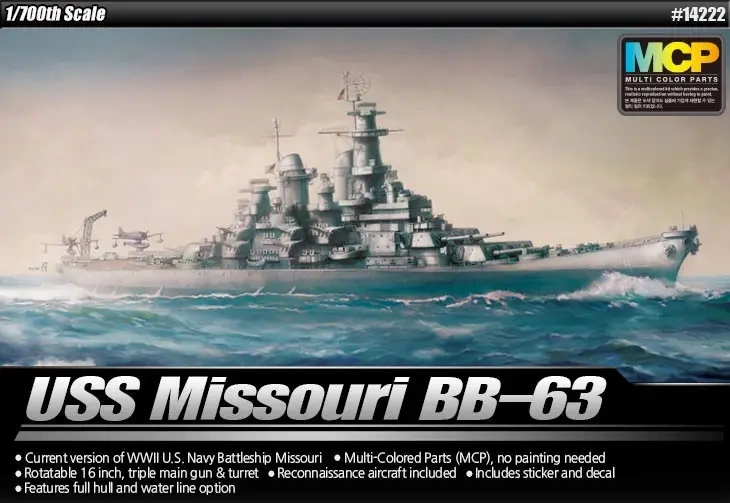 Zestaw zawiera plastikowy model amerykańskiego pancernika typu lowa do sklejania.